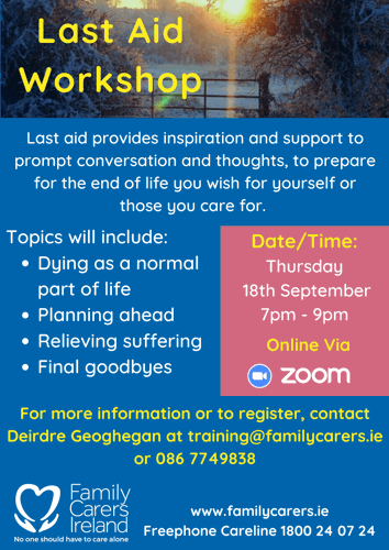 Last aid provides inspiration and support to prompt conversation and thoughts to prepare for the end-of-life you wish for yourself or those you care for. The course aims to educate members of the public to share the basic knowledge and skills of end-of-life care. Family Carers Ireland holds the licence to deliver the Last Aid workshop in Ireland. We are recognised by Dr George Bollig, the author of Last Aid, for our unique affiliation with family carers and how we can support carers through this workshop.