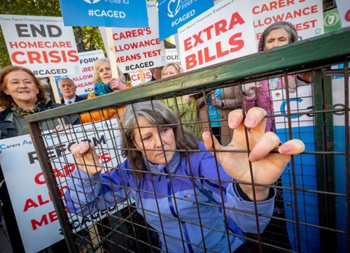 Family carer Jacinta Fortune from Dublin sat inside a cage during today’s #CAGED (Carers Against Government Exploitation & Denial) demonstration outside the gates of Leinster House. Family carers feel trapped and say that the Government does not recognise their contribution or their struggle.