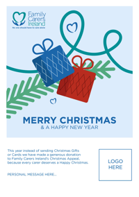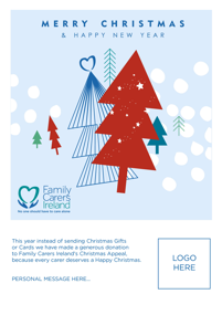 Make a corporate donation this Christmas and we will send you a branded e-card you can send to customers and your network. Contact Charlene Hurley, National Fundraising Manager, on churley@familycarers.ie for more details.