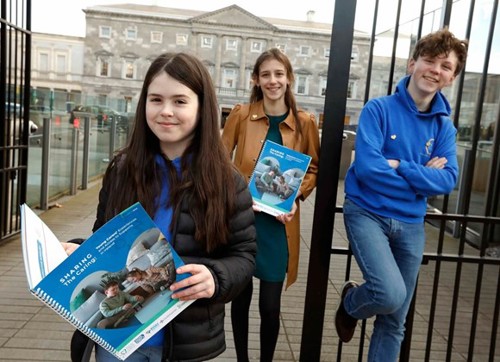 Pictured outside Leinster House at the launch of "Sharing the Caring: Young Carers' Experiences and Access to Supports in Ireland" are (left to right) Sarah Ann Buday (13), Amelia Browne (11) and Liam Donoghue-Dunne (13). PHOTO: Mark Stedman