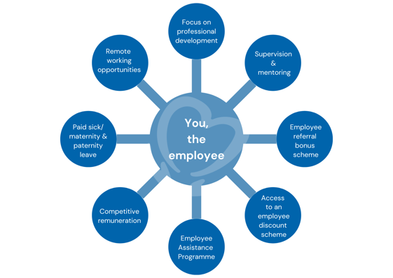 Through working with Family Carers Ireland, our employees belong to an Organisation that supports and values family carers and their loved ones across the country. The sense of personal satisfaction and achievement in being even a small part of this work is something that can’t be quantified. In tandem with this, our employees enjoy a range of tangible benefits as outlined below: